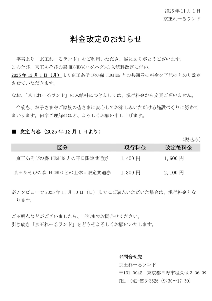 京王れーるランド・京王あそびの森HUGHUG共通入館券の料金改定について